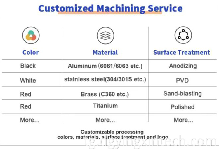 Намудҳои: Брошинг, Прототипи сареъ, Коркарди гилемҳорӣ / кимиёвӣ, Коркарди лазерӣ, Фреза, Дигар хидматҳои механикӣ, Рӯй